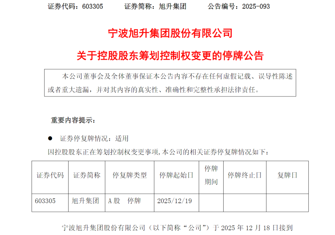 12月18日晚间,旭升集团(603305)发布公告称,接到控股股东、实控人徐旭东通知线上股票配资专业,徐旭东及其一致行动人正在筹划涉及所持有公司股份转让事宜,可能导致公司控制权变更。为避免对公司股价造成重大影响,公司股票自2025年12月19日起停牌,预计停牌时间不超过2个交易日。