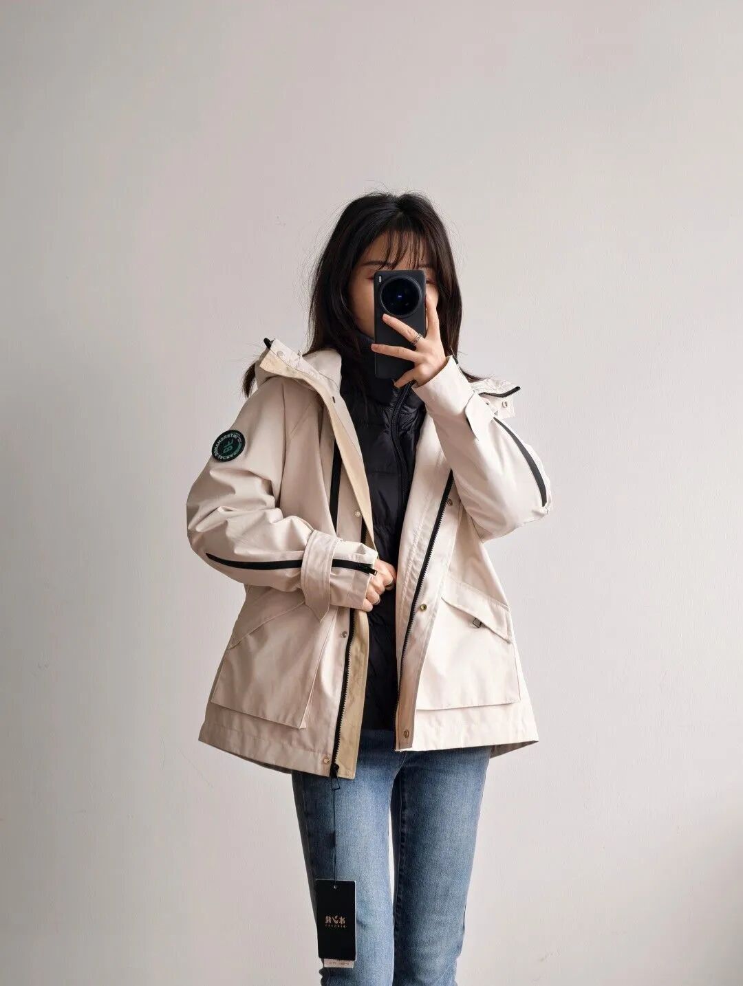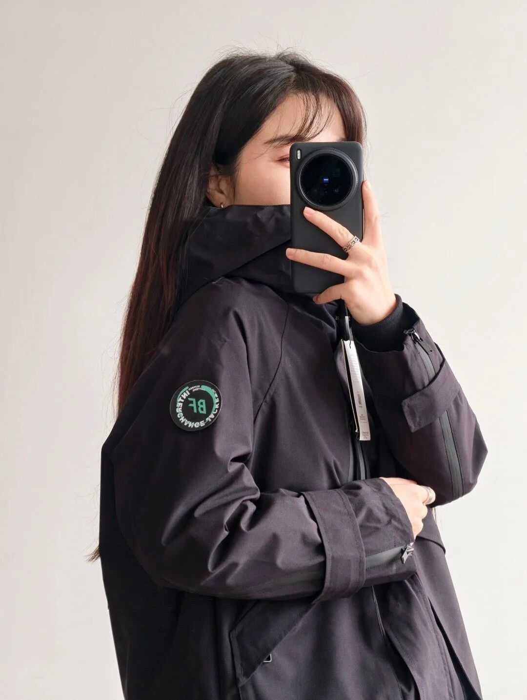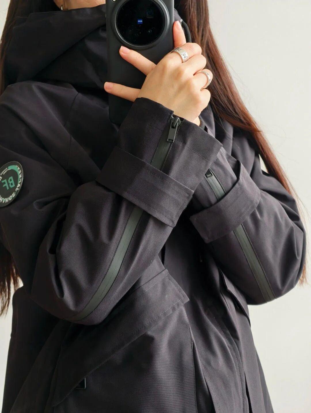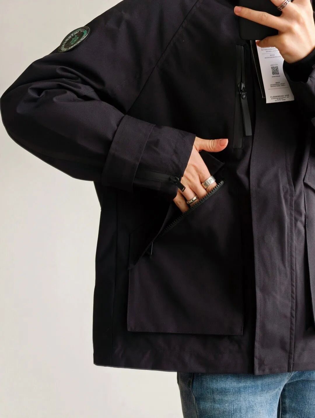 袖子上两条密封硅胶拉链,撞色设计,两侧工装风翻盖大口袋,设计感十足! 立领设计,拉链一拉到顶,加宽帽檐,挡雨也挡雪!