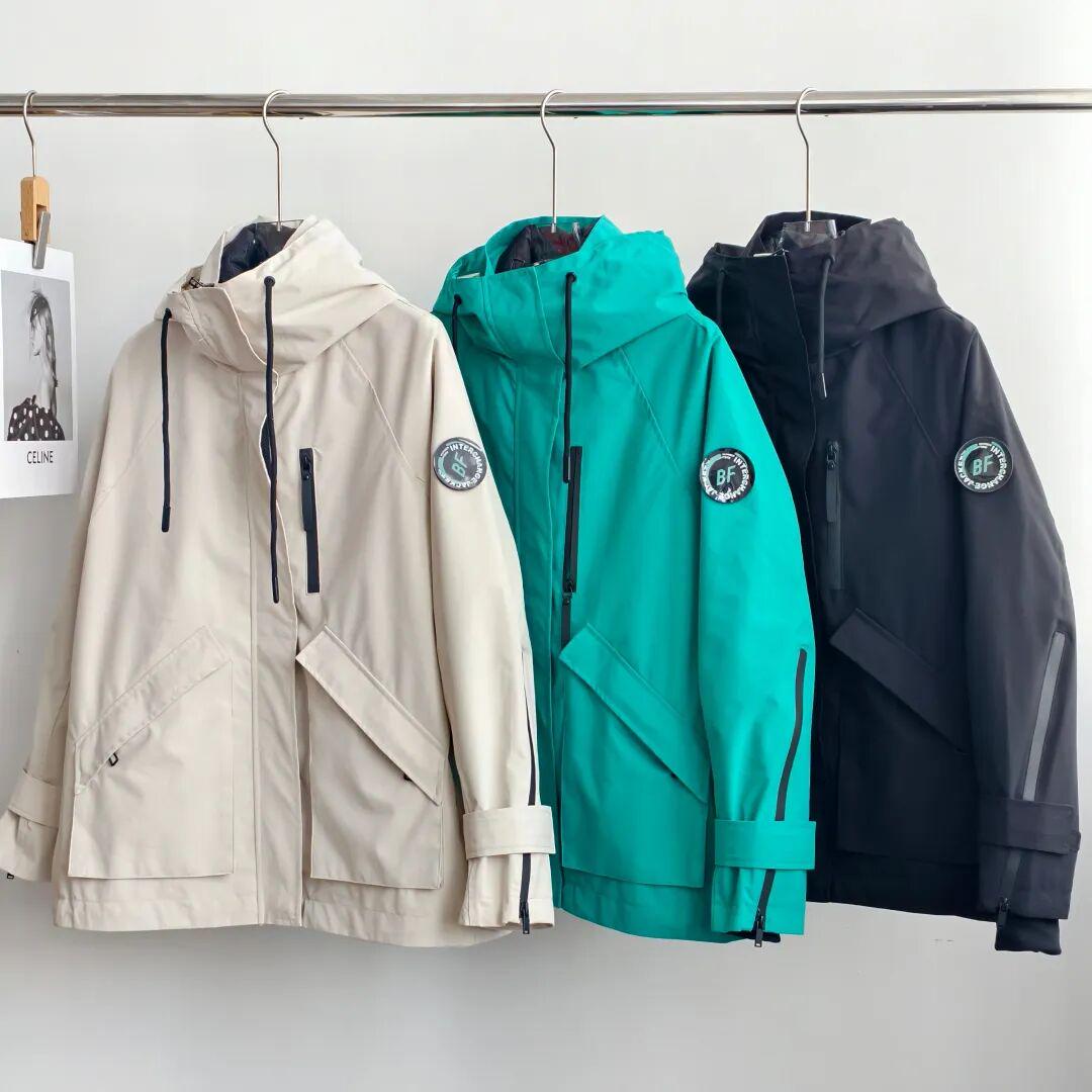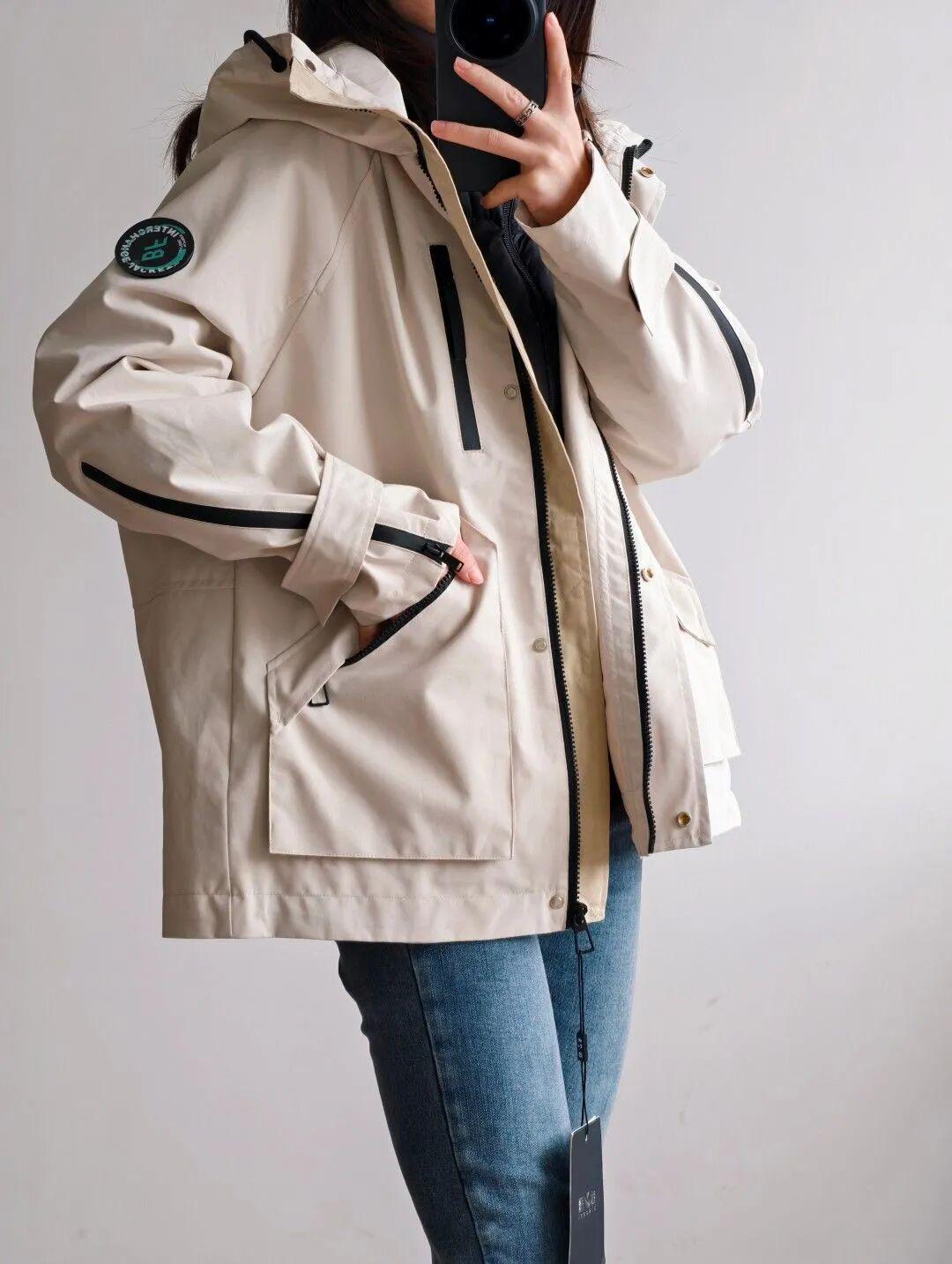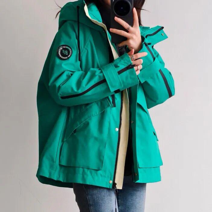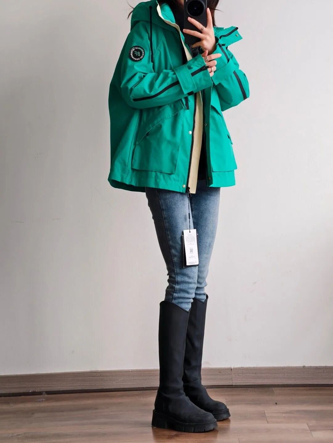 袖子上两条密封硅胶拉链,撞色设计,两侧工装风翻盖大口袋,设计感十足! 立领设计,拉链一拉到顶,加宽帽檐,挡雨也挡雪!